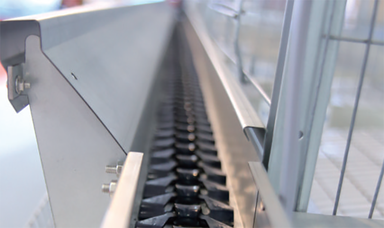 出料口安裝有勻料器、趕雞棒、首尾段殘料回收裝置,減少飼料浪費且喂料均勻,喂料量可根據(jù)日齡、雞品種進行調(diào)節(jié),保證雞營養(yǎng)充足、均衡。